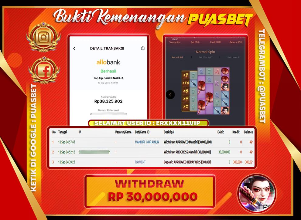 Selamat kepada User id ERXXXX11VIP telah berhasil mendapatkan kemenangan besar pada permainan (PG Soft Geisha’s Revenge ) dengan kemenangan sebesar Rp.30,000,000