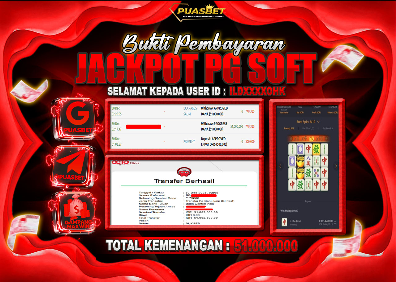 Selamat kepada User id ILDXXXOHK berhasil mendapatkan kemenangan besar pada permainan ( PG Soft Mahjong Ways ) dengan kemenangan sebesar Rp 51,000,000