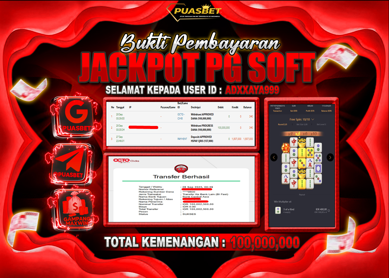 Selamat kepada User id ADXXAYA999 telah berhasil mendapatkan kemenangan besar pada permainan ( PGSOFT Mahjong ways 2 ) dengan kemenangan sebesar Rp.100,000,000