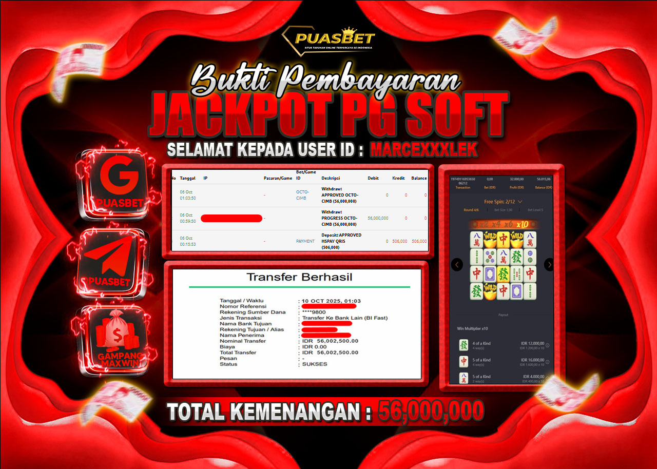 Selamat kepada User id MARCEXXXLEK telah berhasil mendapatkan kemenangan besar pada permainan ( PGSOFT Mahjong Ways) dengan kemenangan sebesar Rp.56,000,000