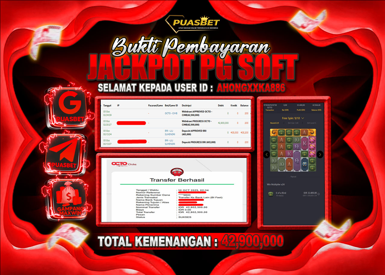 Selamat kepada User id AHONGXXXKA886 telah berhasil mendapatkan kemenangan besar pada permainan ( PGSOFT Mahjong Ways) dengan kemenangan sebesar Rp.42,900,000