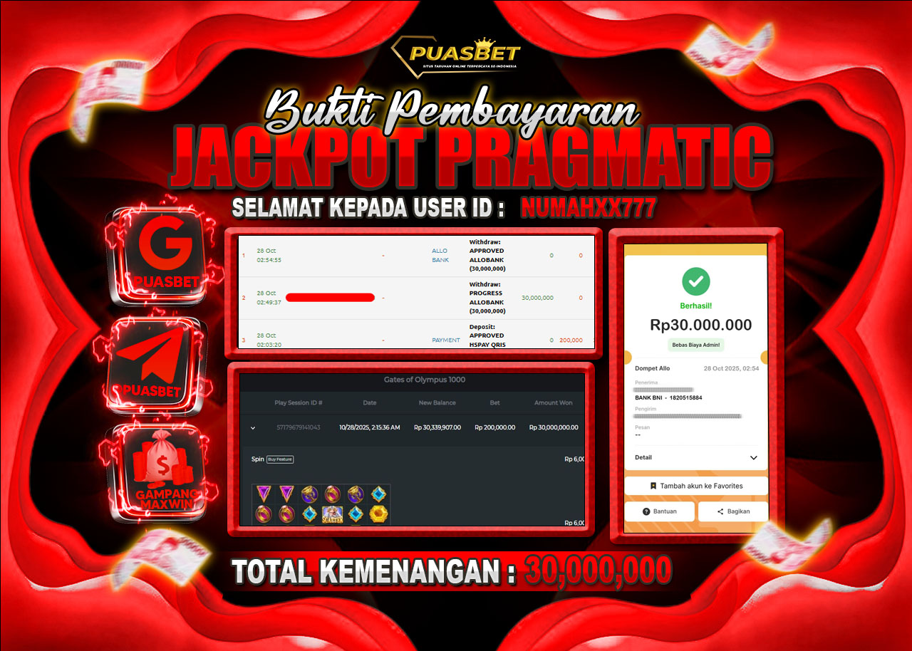 Selamat kepada User id NUMAHXX777 telah berhasil mendapatkan kemenangan besar pada permainan ( PRAGMATIC PLAY GATES OF OLYMPUS 1000 ) dengan kemenangan sebesar Rp 30,000,000