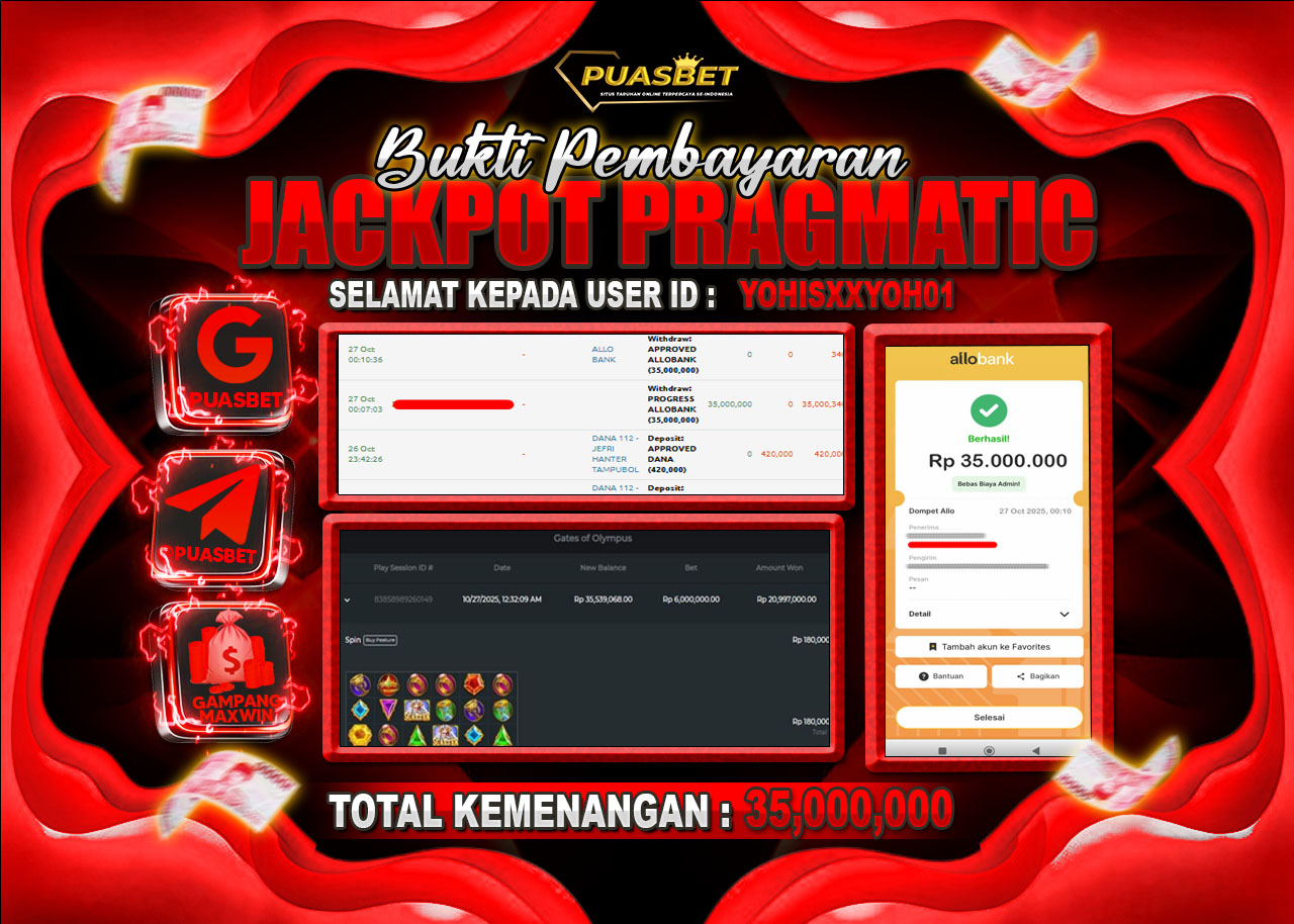 Selamat kepada User id YOHISXXYOHO1 telah berhasil mendapatkan kemenangan besar pada permainan ( PRAGMATIC PLAY GATES OF OLYMPUS ) dengan kemenangan sebesar Rp 35,000,000