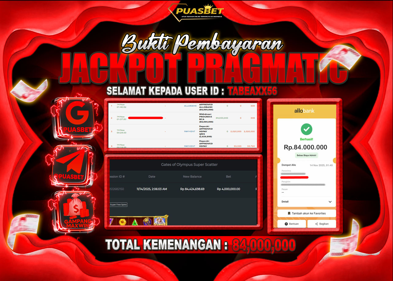 Selamat kepada User id TABEAXX56 ketelah berhasil mendapatkan kemenangan besar pada permainan ( PRAGMATIC PLAY GATES OF SUPER SCATTER ) dengan kemenangan sebesar Rp 84,000,000