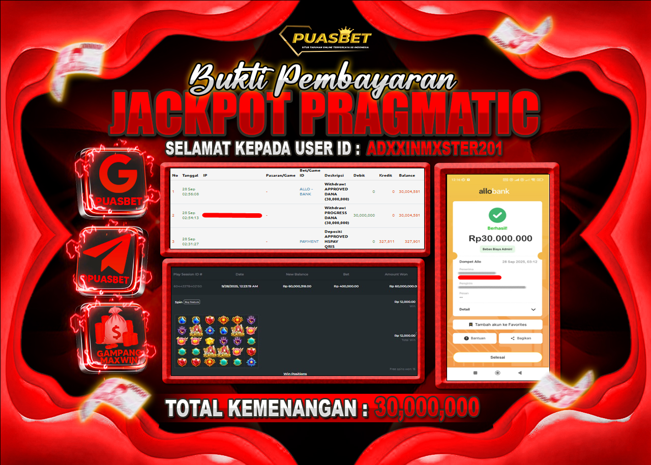 Selamat kepada User id ADXXINMXSTER201 telah berhasil mendapatkan kemenangan besar pada permainan ( PRAGMATIC PLAY Starlight Princes 1000) dengan kemenangan sebesar Rp.30,000,000